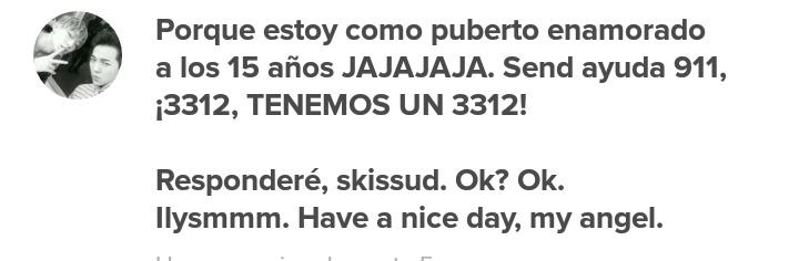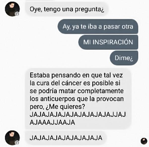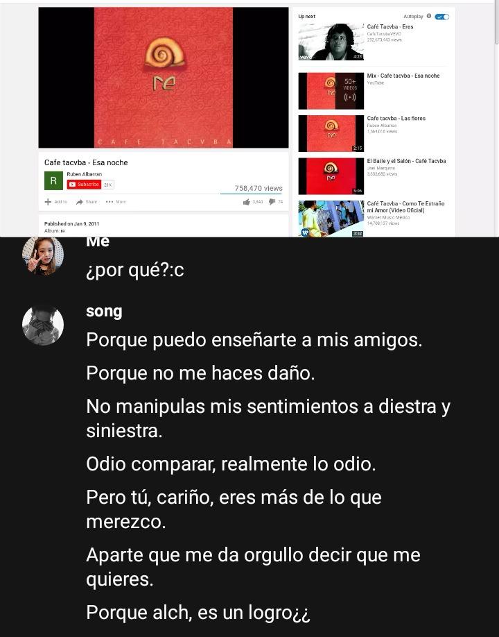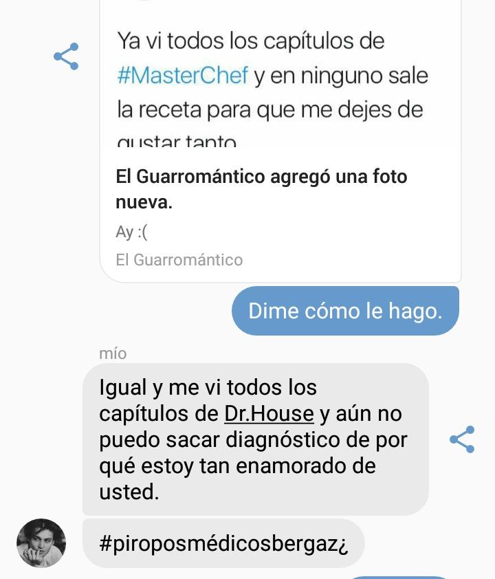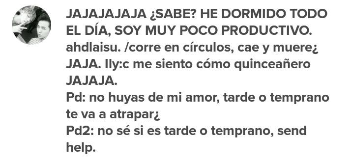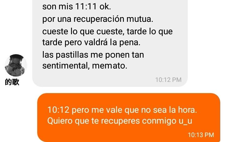 Esta parte resalta lo torpes que éramos al decirnos las cosas, al principio¿? Bc tímidos. En el primer SS, había otras indirectas pero lamentablemente solo me quedó Esa, ah. Peeo no sabía que era indirecta hasta que tú me dijiste, mucho después, porque creí que solos juagabas y reíamos de cosas tontas¿? Pues rara vez conversamos más del "Hola, cosita hermosa, ¿cómo te ha ido?" Y pues pensaba que era normal u_u pero lo que no sabías es quw yo siempre quería hablar contigo y te buscaba de distintas formas pero la vida se encargaba de hacerme fallar en el intento.